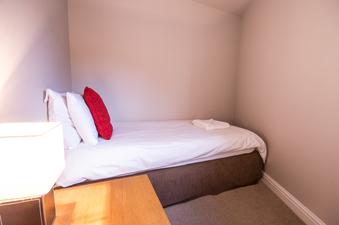 Hartington’s bedrooms are located between the two floors of the building. On the ground floor, there is a spacious twin room with an ensuite shower room. This has a king-size bed that’s zip and link so it can be made up as preferred.